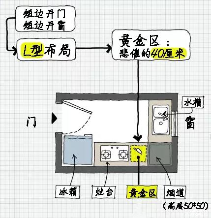 下面簡單解釋,為什么煙道位置和冰箱大小也會(huì)影響廚房的布局。很多建筑師喜歡把煙道放在下圖中轉(zhuǎn)角的位置,但實(shí)際上,這樣會(huì)打斷黃金區(qū)域,想象一下,剛切好的菜要高過煙道下過的場景吧!