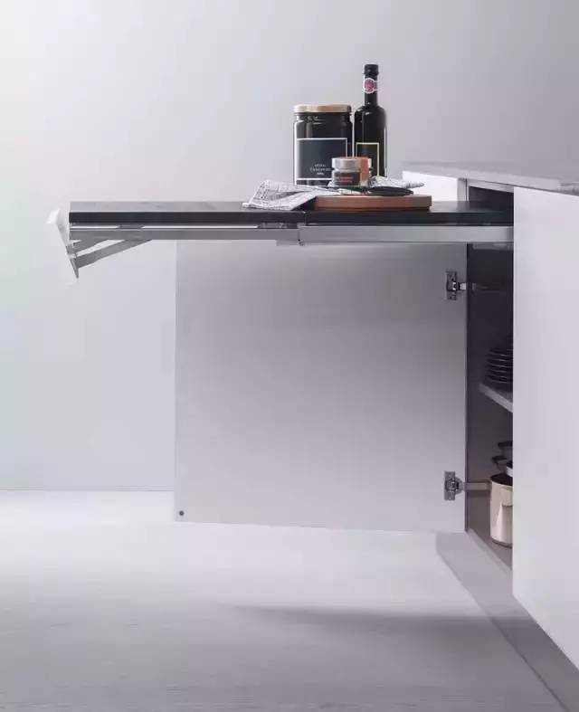 對(duì)于面積不大的廚房來(lái)說(shuō),善用五金構(gòu)件可以給柜子多做一些移動(dòng)拉板,不僅可以擺放廚房家電,小拉板也可以變成獨(dú)立的操作臺(tái),方便又實(shí)用。