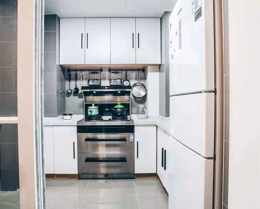 進(jìn)門左手邊是廚房,屋主在廚房的設(shè)計上還是很注重時尚感的,黑白灰的配色不會過時,更重要的是看起來還十分干凈,廚房門可是推拉門哦,再也不怕打開冰箱裝上門了~