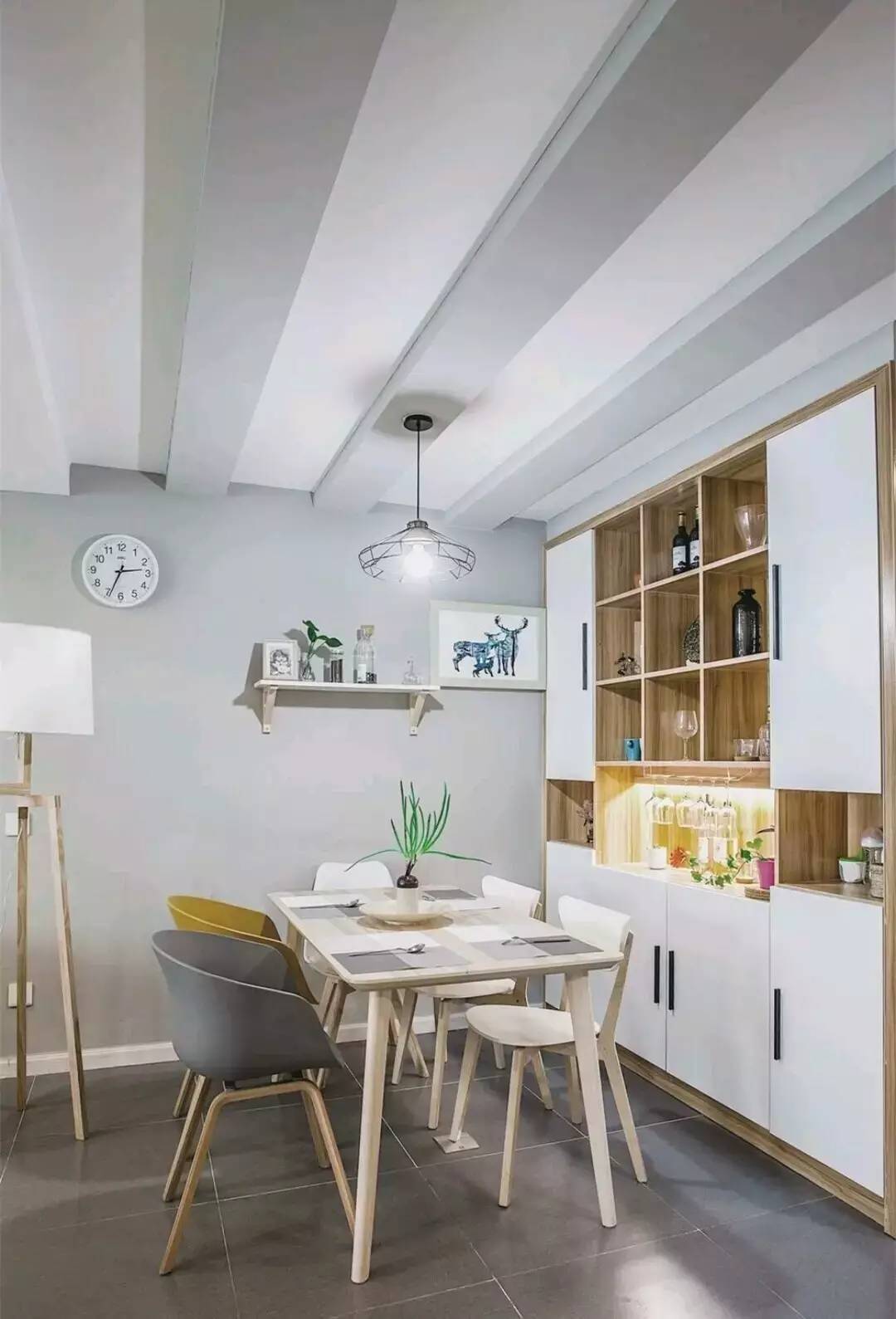 屋主說餐廳與客廳之間有根大橫梁,所以在餐廳區(qū)域做了幾根假梁,不僅弱化了真梁的存在感,而且還具有很強(qiáng)的裝飾性,這個設(shè)計真的很贊哦~