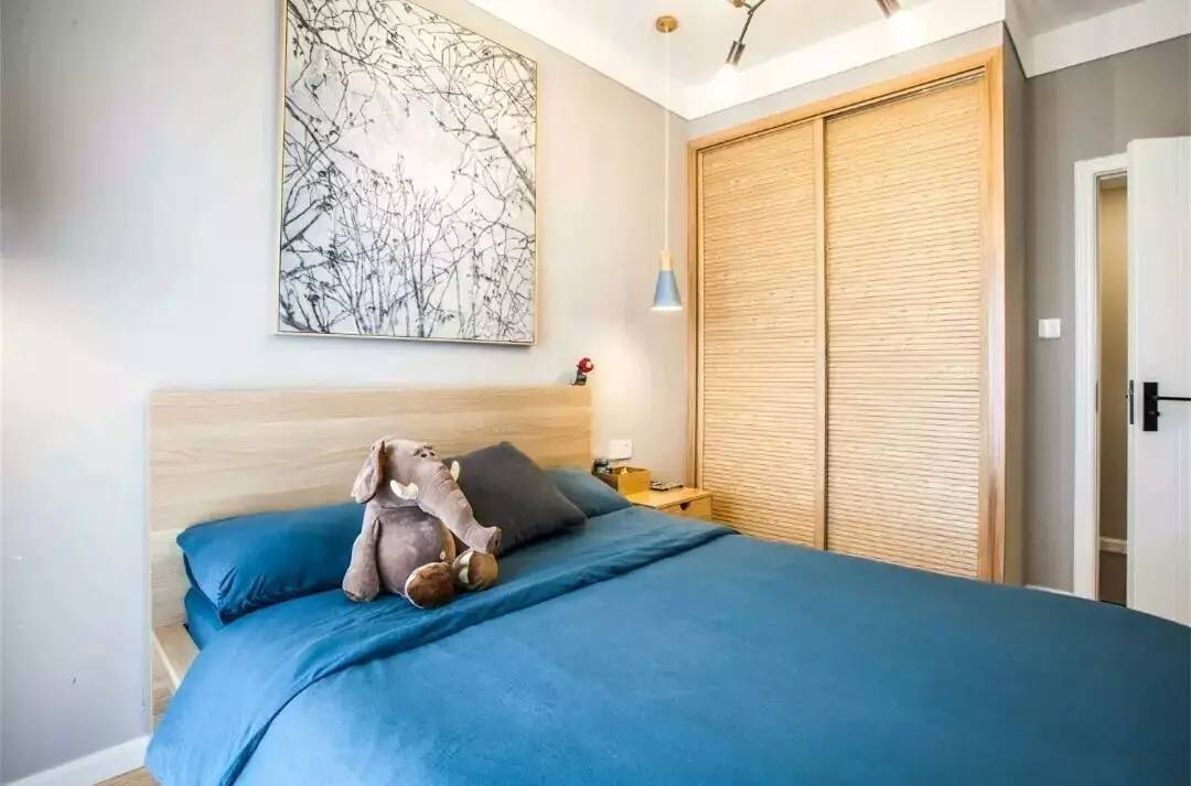 同時,次臥則采用藍(lán)色的床單,背景同樣是樹枝掛畫,進(jìn)門的推拉門的大衣柜,顏值還是很高的嘛,懸掛的小吊燈也很有趣哦。