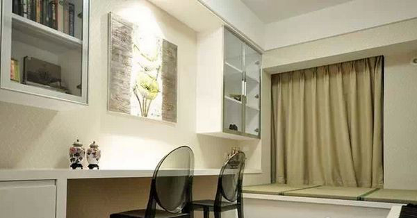 小戶型公寓里,設(shè)計榻榻米,是一物多用的。貼著墻壁設(shè)計書柜、書桌臺面,榻榻米上配置合適的坐墊,這樣以最節(jié)省的空間完成了書桌布局,同時榻榻米上還是休閑區(qū)、會客區(qū),然后還是臥室,這樣的功能足夠強(qiáng)大的了