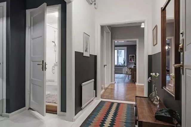 玄關(guān)看起來(lái)比較寬敞,只放了幾件比較簡(jiǎn)單的物件,鞋柜做在右手邊的隔間里。地面鋪上色彩鮮明的地毯,給空間帶來(lái)了一絲跳躍的感覺(jué)。