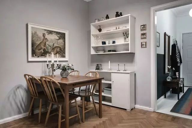 餐廳沒(méi)有過(guò)多的裝修,只做了小巧精致的餐邊柜,墻上用藝術(shù)畫(huà)做點(diǎn)綴。實(shí)用又清爽。雖然黑、白、灰是北歐風(fēng)格的經(jīng)典搭配,但是充滿自然氣息的木質(zhì)家具也是不錯(cuò)的選擇。