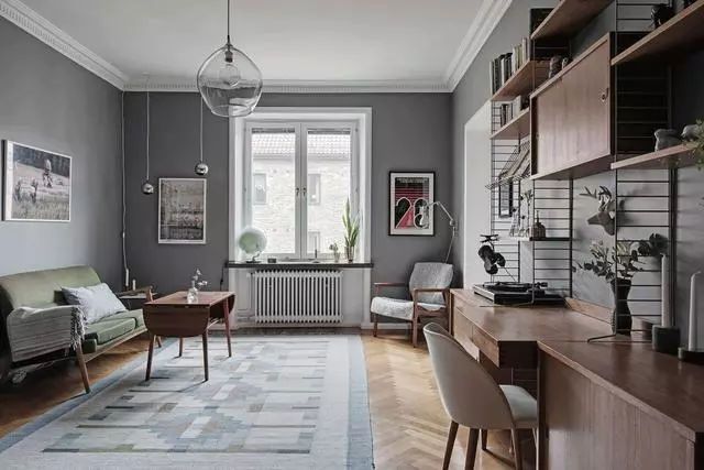 小尺寸的家具把不大的客廳顯得寬敞,一點(diǎn)不阻擋視野。地毯和木地板的搭配也是北歐風(fēng)格常用的設(shè)計(jì)元素。