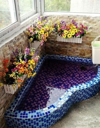 在封閉式的陽(yáng)臺(tái)上,給小寶貝做個(gè)小水池,里面養(yǎng)幾條小魚(yú),窗臺(tái)矮墻上放幾盆花藍(lán),讓孩子搬個(gè)小凳子在這里玩釣魚(yú)吧!