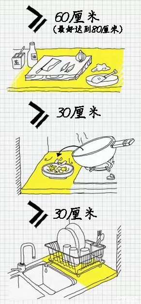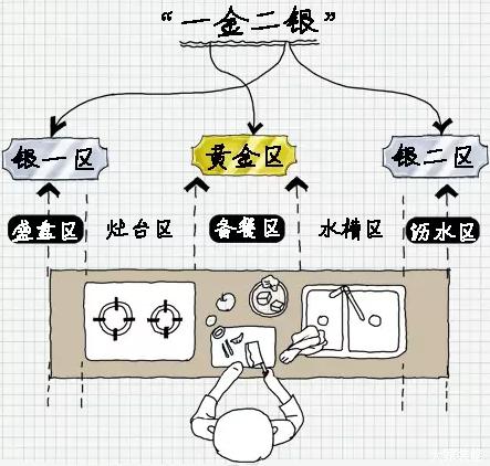 黃金區(qū):放菜板、菜刀、切菜的區(qū)域。活兒最多,東西也最多。