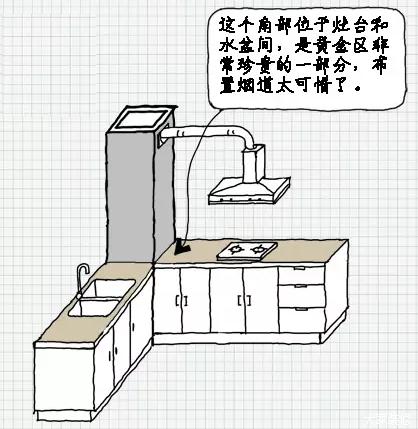下面簡單解釋,為什么煙道位置和冰箱大小也會(huì)影響廚房的布局。很多建筑師喜歡把煙道放在下圖中轉(zhuǎn)角的位置,但實(shí)際上,這樣會(huì)打斷黃金區(qū)域,想象一下,剛切好的菜要高過煙道下過的場景吧!
