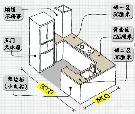 聊了那么多原理和數(shù)字,可能你已經(jīng)有點(diǎn)暈了,很正常,畢竟廚房是家中最復(fù)雜的空間,沒有之一!這里就推薦一款我覺得最合理的廚房布局:
