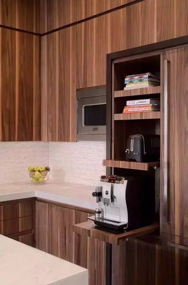 對(duì)于面積不大的廚房來(lái)說(shuō),善用五金構(gòu)件可以給柜子多做一些移動(dòng)拉板,不僅可以擺放廚房家電,小拉板也可以變成獨(dú)立的操作臺(tái),方便又實(shí)用。