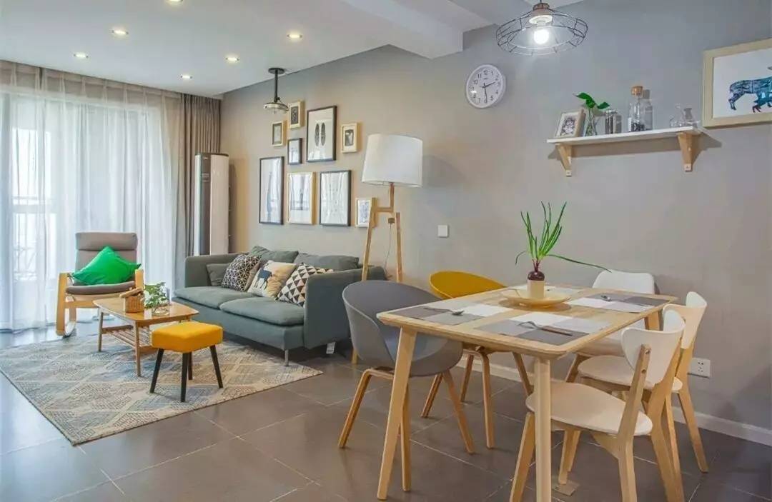 從這個角度看客廳,餐廳和客廳的過渡十分自然,原木的餐桌和灰黃的椅子搭配,灰色的沙發(fā)和黃橘色的茶幾椅也是相映成趣,總的來說,屋主的空間色彩搭配手法非常厲害啊。