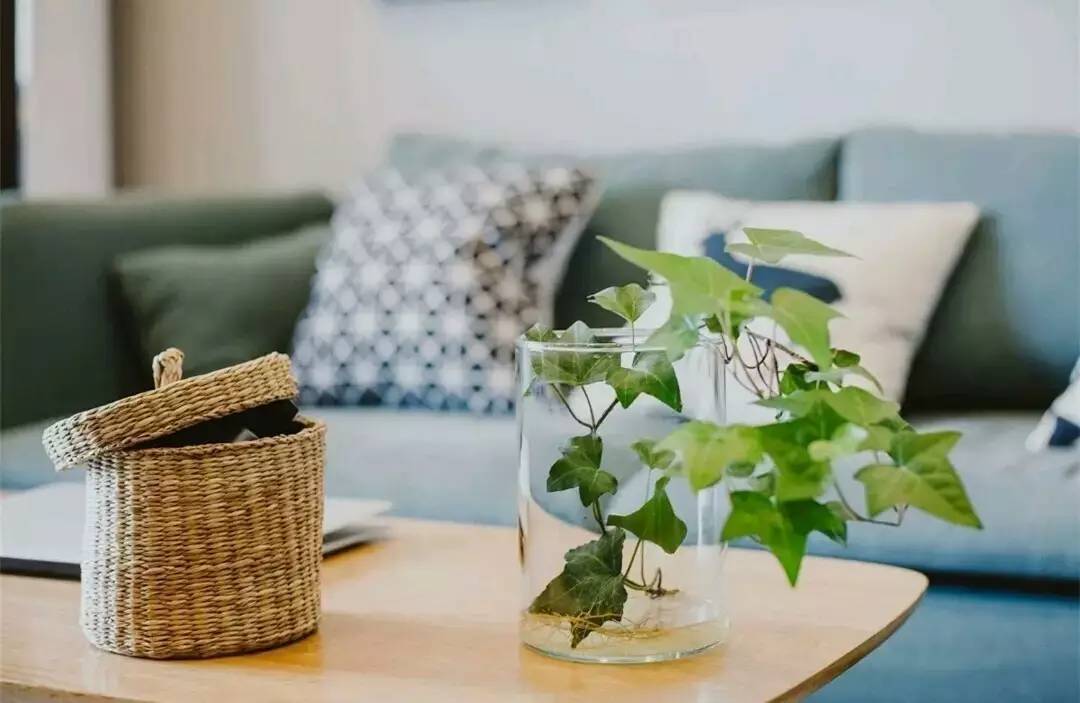 在小茶幾上擺放著常春藤,看到之后心情也能大好,還有這個編織儲物盒,既美觀又實用,放點小物件什么的真的很方便哦~