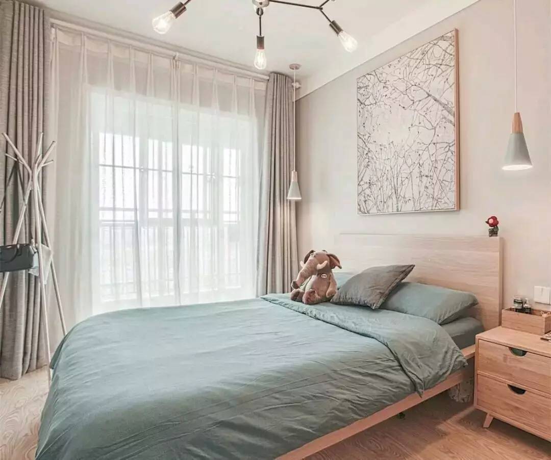同時,次臥則采用藍(lán)色的床單,背景同樣是樹枝掛畫,進(jìn)門的推拉門的大衣柜,顏值還是很高的嘛,懸掛的小吊燈也很有趣哦。