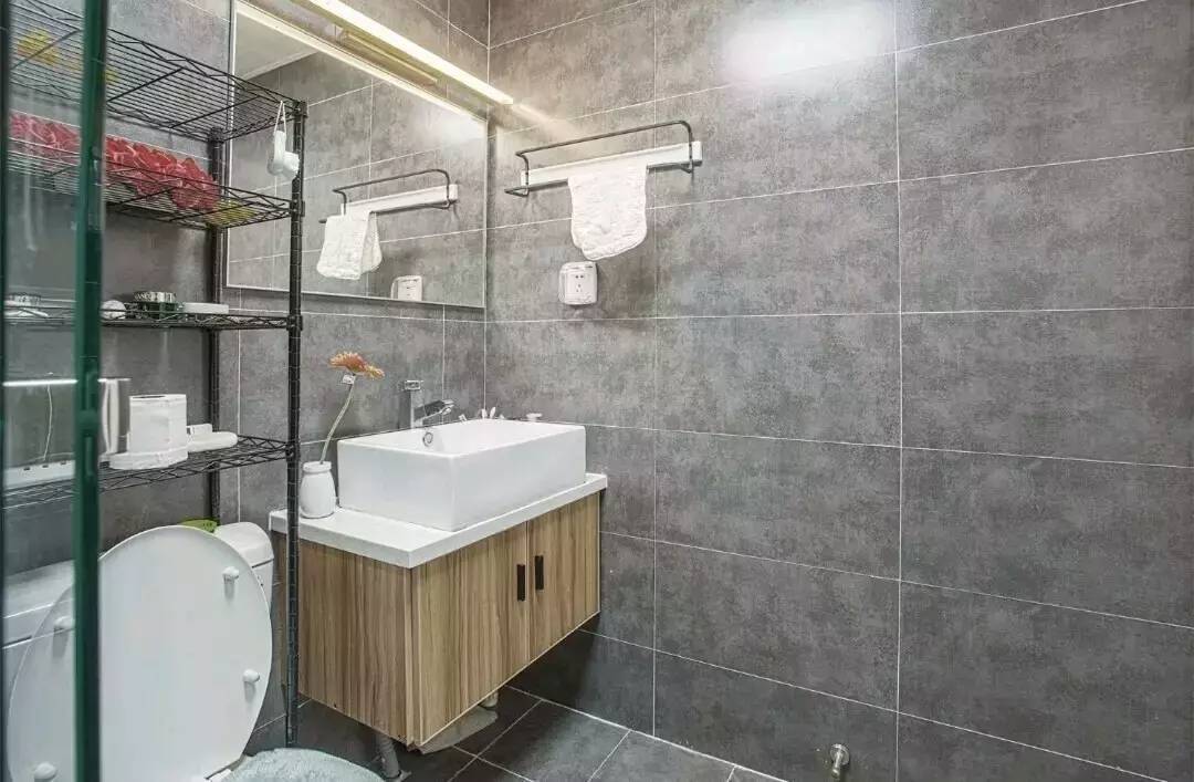 衛(wèi)生間地面及墻面是水泥磚墻,這樣的設(shè)計讓空間看起來更大了,有沒有?還有馬桶后面的置物架,填補(bǔ)了衛(wèi)生間的收納空白,很貼心的設(shè)計。