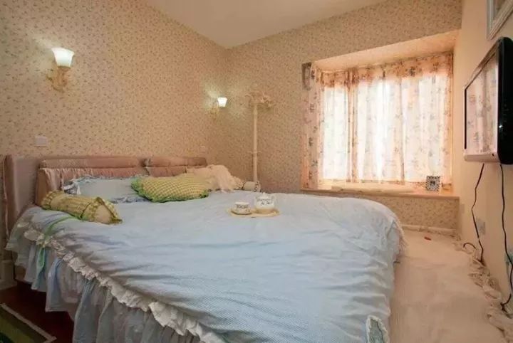 ▲主臥比較簡單,木質(zhì)板床和大花的壁紙。