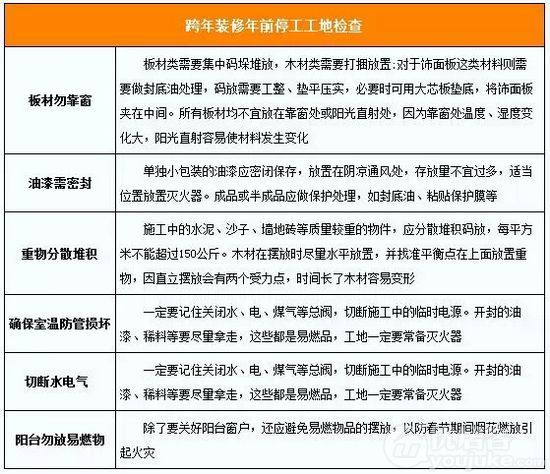 過年前幾天施工隊(duì)會(huì)停工,在停工的時(shí)候要做好檢查工作。業(yè)主要按裝修合同進(jìn)行單工施工檢查,象水電鋪設(shè)、墻壁粉刷這些都要徹底完工,不能搞一半停工,如果之前就預(yù)計(jì)年內(nèi)難以完成某項(xiàng)工程,那么年內(nèi)這項(xiàng)工程就不要開工了,徹底等到年后再做。