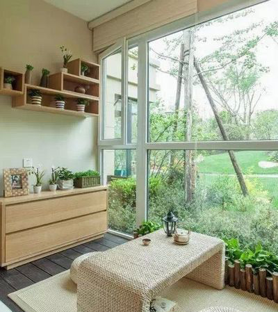 陽臺選擇設(shè)計成封閉落地窗,榻榻米上安置了坐墊和茶幾,草藤制品的茶幾、坐墊有著原生態(tài)的自然感,坐在這里品茶,看著窗外的綠意盎然,整仿佛一切都是那么的清新恬淡,天地之間寧靜和素雅陪伴著,太有情調(diào)了。