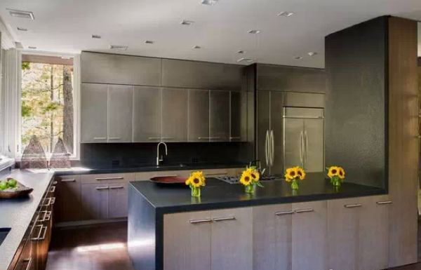 廚房臺面可以選擇石板臺面,石板臺面的硬度比花崗巖要低一些,它也是一種天然石材,表面相對粗糙,它的好處是容易清潔,可以直接拿水洗,但是它容易滋生細(xì)菌,這點(diǎn)要注意。