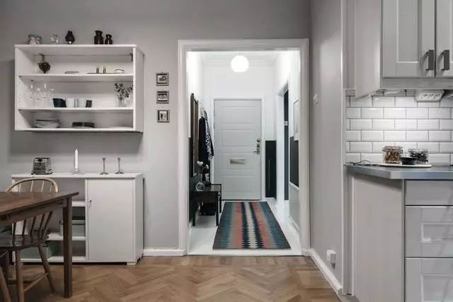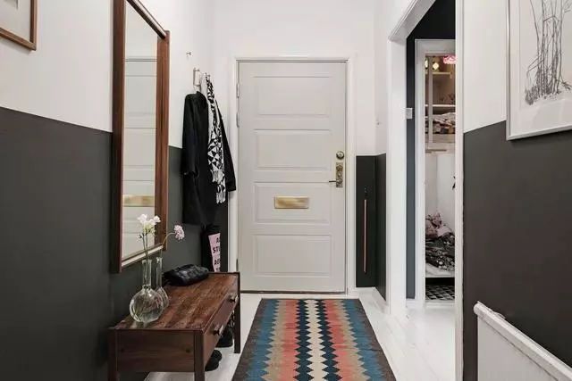 玄關(guān)看起來(lái)比較寬敞,只放了幾件比較簡(jiǎn)單的物件,鞋柜做在右手邊的隔間里。地面鋪上色彩鮮明的地毯,給空間帶來(lái)了一絲跳躍的感覺(jué)。