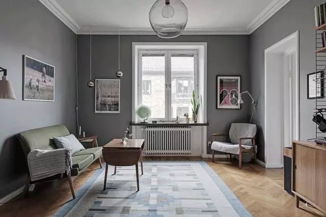 小尺寸的家具把不大的客廳顯得寬敞,一點(diǎn)不阻擋視野。地毯和木地板的搭配也是北歐風(fēng)格常用的設(shè)計(jì)元素。