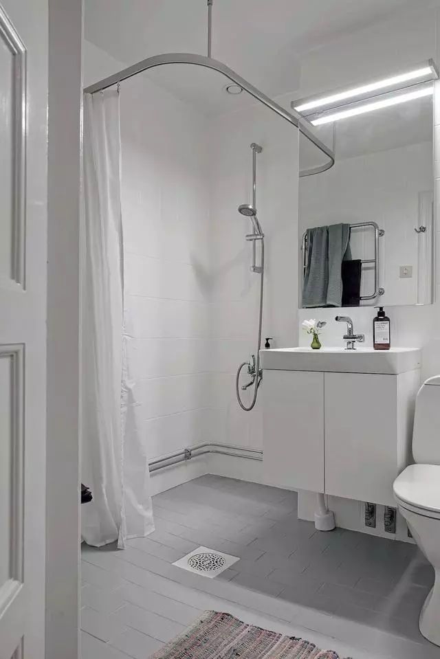衛(wèi)生間比較小,站在門(mén)口就一目了然。布簾是小衛(wèi)生間做干濕分離的好選擇。不占用空間,還可以拆下來(lái)清洗。
